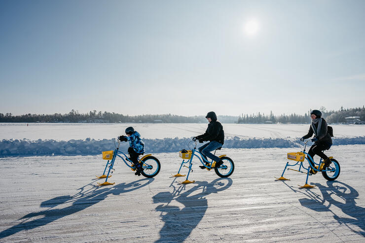 Kenora’s newest eco-tourism business is Mosswood Adventures and Rentals. This pop-up takes advantage of the big beautiful frozen Lake of the Woods on the city’s doorstep as well as other local lakes, and it aims to provide winter experiences that are inclusive and welcoming, without a giant learning curve. That’s where the ice bike rentals come in. An ice bike has a bike tire at the back, and skates or skis at the front, so you can simultaneously pedal and slide over the ice. Go solo or pedal side-by-side with a buddy, and there are options to bring small kids or even furry friends along for the ride too.