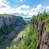 The freshly paved dual highway, high over the water, transcends our thoughts as we see the Sibley Peninsula where the Giant rests to our east. On the Pass Lake road, we are immediately under the shadow of a huge train trestle bridge with its rusting girders dwarfing us as we crane our necks to see more. Moments later as we cross Portage Creek, we wonder if this route was once used by the voyageurs hundreds of years ago to open up the area with their furs and goods? Our car slows a bit as the forest envelops us and we enter Sleeping Giant Provincial Park.