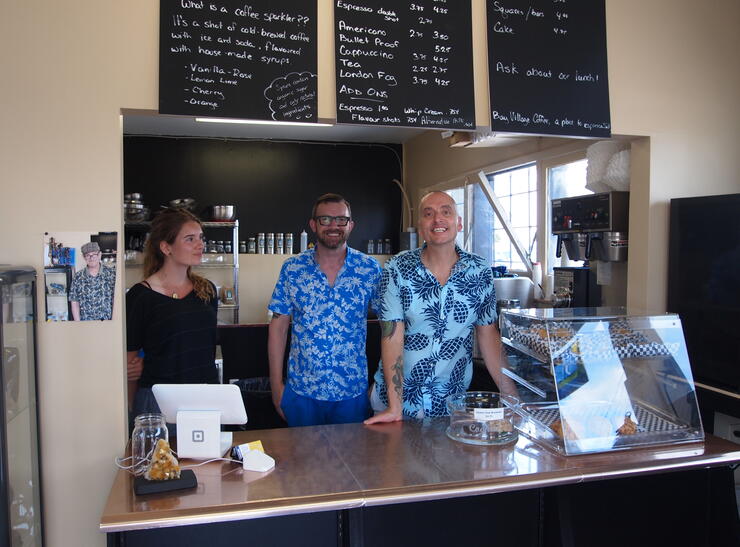The coffee is organic, fair trade, and locally roasted. A roster of lattes, espressos, cappuccinos, Americanos, and teas are available with their cold drink summer cousins, including Bay Village's own popular creation, the Coffee Sparkler, which is a cold brewed coffee with soda, ice, and their own home-made syrup. Their supplier for coffee is Rose N Crantz Roasters whose Rwandan coffee is a popular favourite. The Kombuchas (cold fermented teas) are locally made.