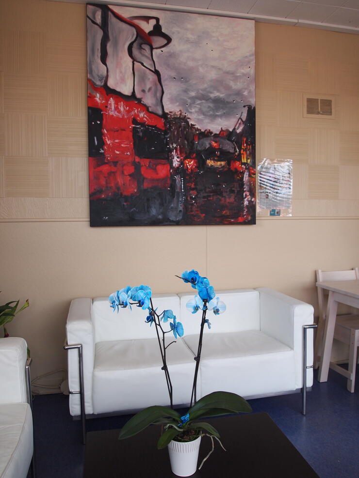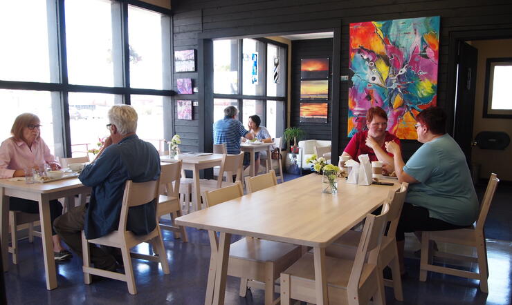 Local art for sale is featured on the walls. A bookcase and odd shelf act as gift shop, offering work made by local crafters.