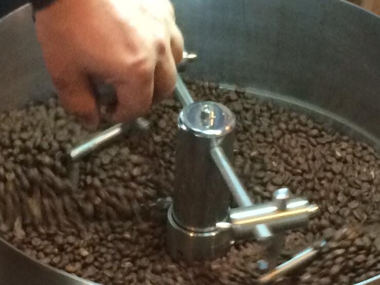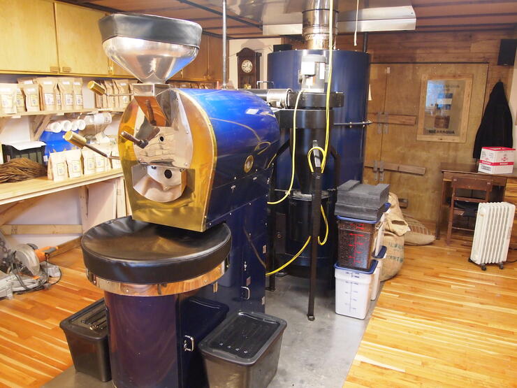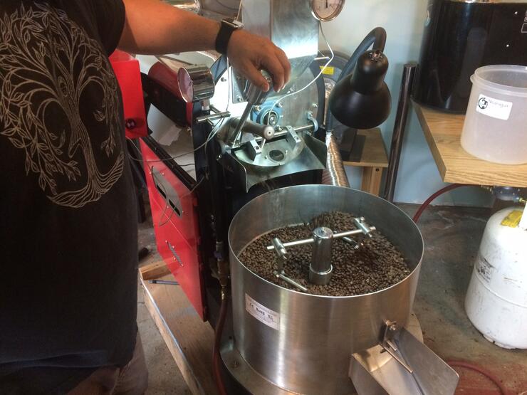 Dan Dampier, a retired mechanical engineer began his roasting business, Wolfhead Coffee, only last year in 2015 with a major investment in a second hand roasting machine, a Diedrich IR 12 roasting tank, made in Idaho. Brand new, these tanks sell for around a hundred thousand dollars. Looking much like the engine of a miniature old train the tank is designed to roast up to 20lbs in one session, but Dan designed the tank to roast and smoke a pound of coffee at a time. From the hopper on top the beans are funneled into a drum that rotates and heats the beans. Dan can supply a number of coffee shops and restaurants in town and easily expand to other communities. It’s quite the leap for Dan who once ran his own mining exploration company and created mechanical engineering designs for companies that were sinking mine shafts all over Canada and the world.