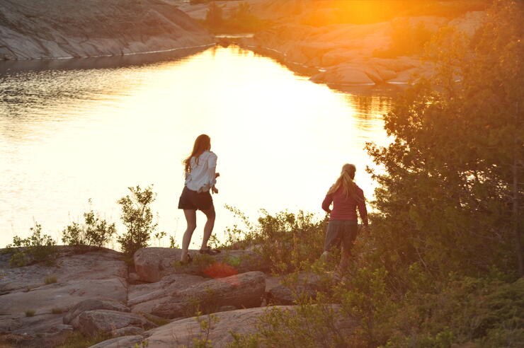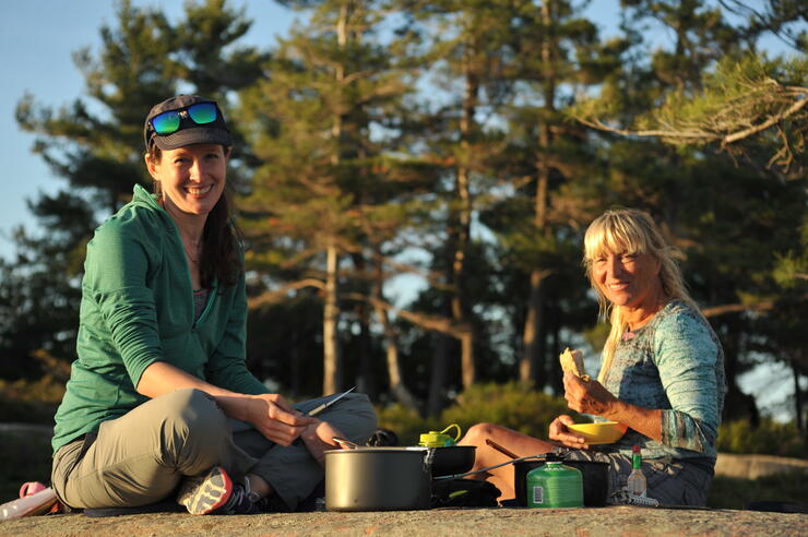 The views from our basecamp on the island’s south end, just an hour’s paddle from the launch, awe moms and daughters alike: the red-and-white towers of Snug Harbour and Red Rock lighthouses, the granite whalebacks of the Savage Rocks and the surreal calm of the restless lake.