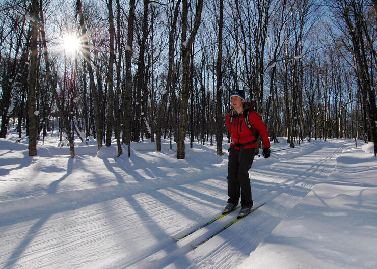 Sleeping Giant’s ski trails bisect a transitional forest where hardwoods like maple give way to the spruce and birch forests of northern Canada.